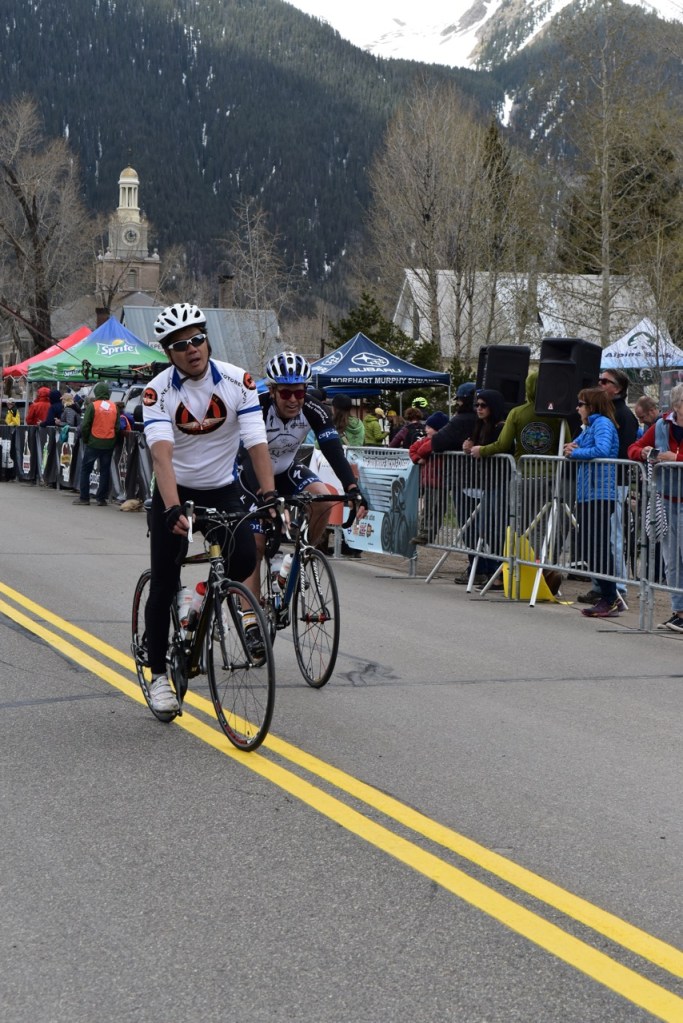 I rested my forearms on the tops of my bars and time trialed to the base of the first climb. On Coal Bank Pass the race official’s vehicle pulled up next to me and told me I had a six mintue gap. It was beautiful riding higher and higher into the mountains but it was getting more difficult and I knew they would be charging hard across that gap. I told myself that if I make over Coal Bank Pass still solo that I had a chance to hang on for the win. I did go over Coal Bank solo and started the Molas Pass alone as well, but when I glanced across the valley I saw the orange kit of the Rally Cycling rider Sepp Kuss about a minute behind. I was suprised how quickly he caught me and how effortlessly he spooled by, like climbing on air. I kept my own pace and started looking over my shoulder, but didn’t see anyone else. I crested Molas Pass ok, stayed safe on the descent, and pedalled hard up through the tunnel of cheering fans. You can’t help but get shivers, and feel so happy to have made it, knowing you did your best effort on the ride. It was awesome. The first person I saw was Matt Caruso of Caruso Cycleworks, my mechanic, and then I found Mai. It was a fun celebration. As the racers came in we all congratulated one another, happy for each other and the challenge, laughing as we recapped our experiences. The spirit of cycling in Durango is positive, energitic, rewarding, super fun.