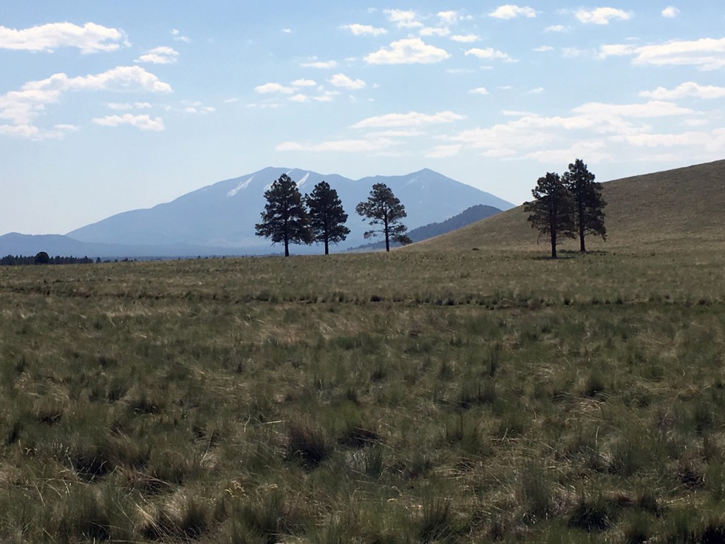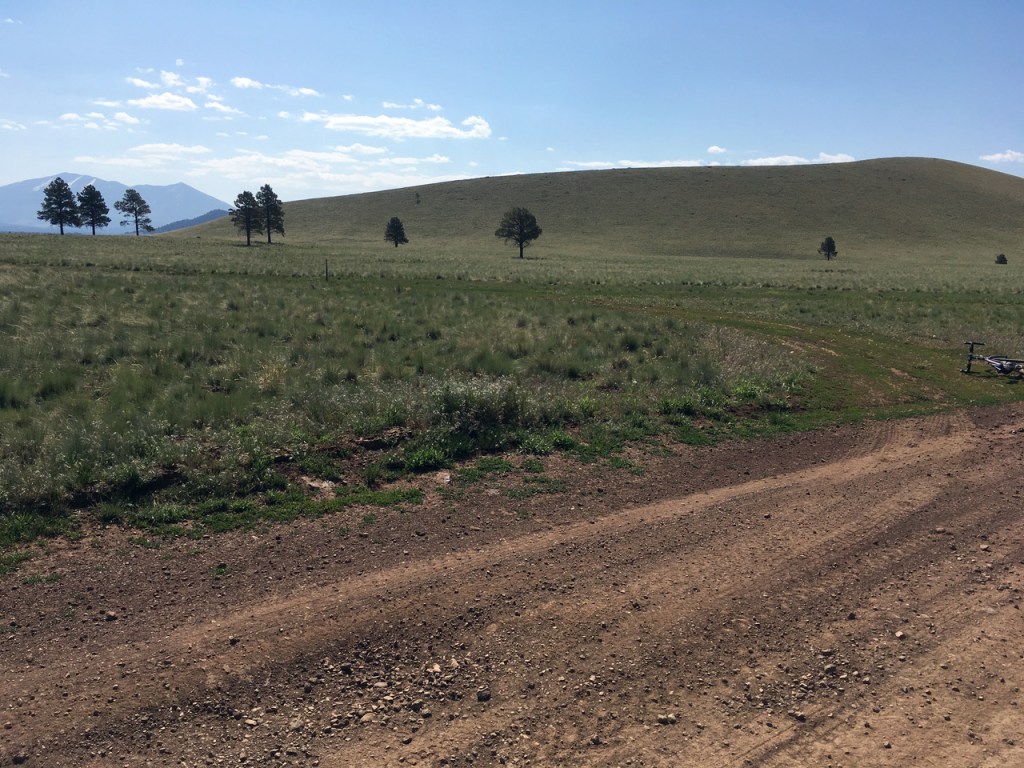 These wheels are pretty strong. Had them built last summer, set up tubeless, and now can ride fatter tires. 35 rear, 40 up front. My first long ride on them was this same route, I think. It was before I did that ride put on by that organization in Phoenix, riding up to the Canyon. I did not know anybody on the ride, but my daughter ran the scheduling for friends who were giving massages at the finish. We all camped there that night. And then I ran into Dara – Troy was off doing something – and so there was someone to chat with. She had her little gas molecule with her, running around playing. I was beat from riding a cross bike on a mountain-bike course, but bang! Didn’t see that rock in the shade. I really should get some lighter sunglasses so I can see in mottled light. Legs still feeling good. Dropping down behind Wing Mountain. Cool, a coyote! And cows. Rejoice, rejoice! I wonder where that song comes from. Can’t think of any more words to it – could it be from Dad’s temple? No, I can’t remember singing there. Mom’s church? Maybe – they did a lot of singing back then. It was an ecumenical time. That seems to have passed – do churches still invite people from other faiths to discuss their belief systems? I learned a lot from those but I can’t seem to believe in the Judeo-Christian-Muslim god any more. After seeing my daughter in the hospital with Stevens-Johnson syndrome, skin blistering from a reaction to her epilepsy meds, I couldn’t see any god that allowed that as merciful or loving, or else he/she/it wasn’t very powerful. The forest feels powerful today. Maybe god is something else. Cool, arriving at road 222. Fast and no traffic – haven’t seen a car moving yet. Where is my shortcut – that one? No, I’ll recognize it. Don’t second-guess yourself. There it is – turn off! A couple mule deer. Now road 171 – heading toward Kendrick. The lava tube is over there. It is nice the tourists don’t know about the better caves. Ahh, the first car passes me, respectfully and slowly, keeping the dust down. Give them a wave. Oh, two hours in now, time to eat something. Quiet out here, good time to sit. Rejoice, Emmanuel, whoever you are! Along the foot of Kendrick and then south on road 100 through Government Prairie. Pass the Government Prairie vent – coolest scoria cone around, with benmoreite, rhyolite, and dacite all erupted together. The students I take here are always amazed and confused by it. What a wide-open area!