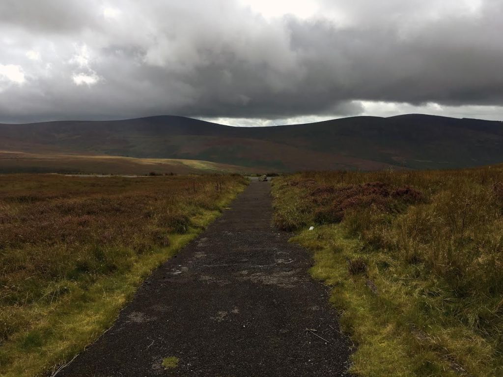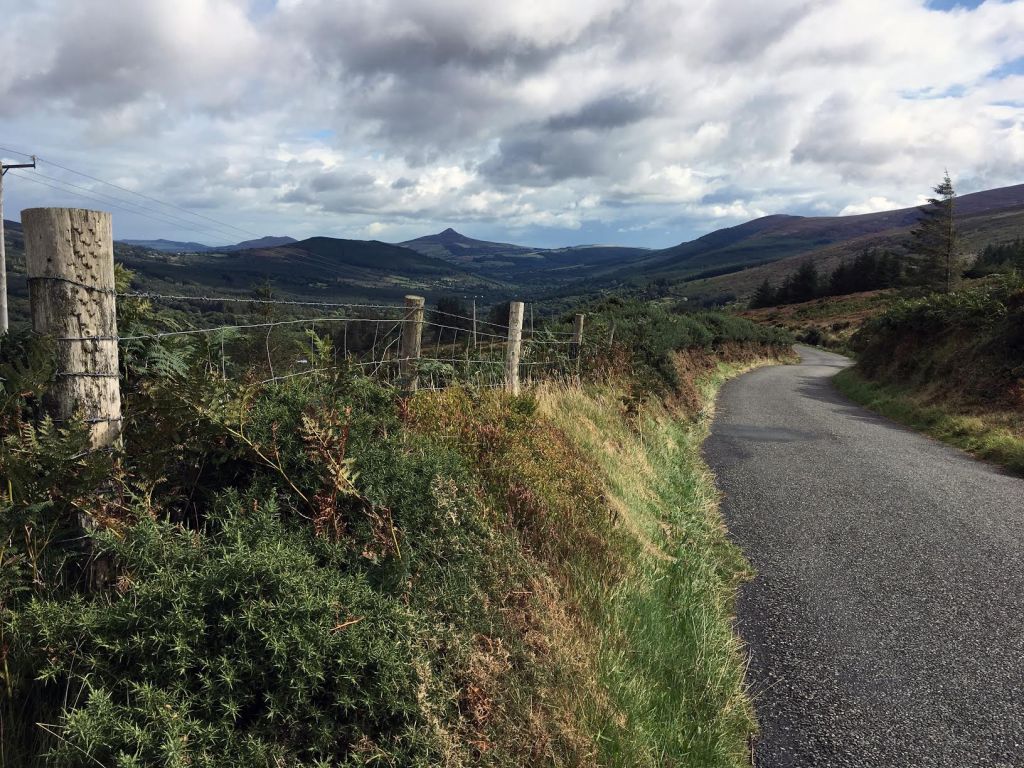 Continuing down the hill from the pass, I skirt above the Glencree barracks, once an English army base and now a well-touristed coffee shop and a Centre for Reconciliation of Conflicts. Then up another pass toward Sally Gap, where four different roads cross in a high, broad, open, bog-filled valley. At the crossroads, I choose left and head down – that is where I hit my maximum speed, in a pouring rain.
