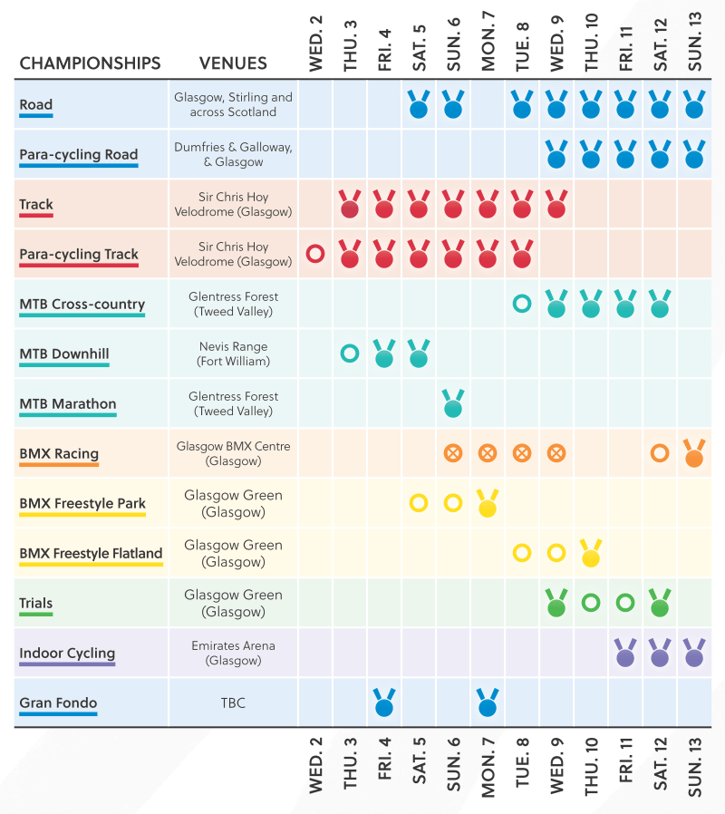 Worlds schedule of events 2023, Glasgow and across Scotland. “Scotland is Bikeland.” #PowerofTheBike https://www.cyclingworldchamps.com/
