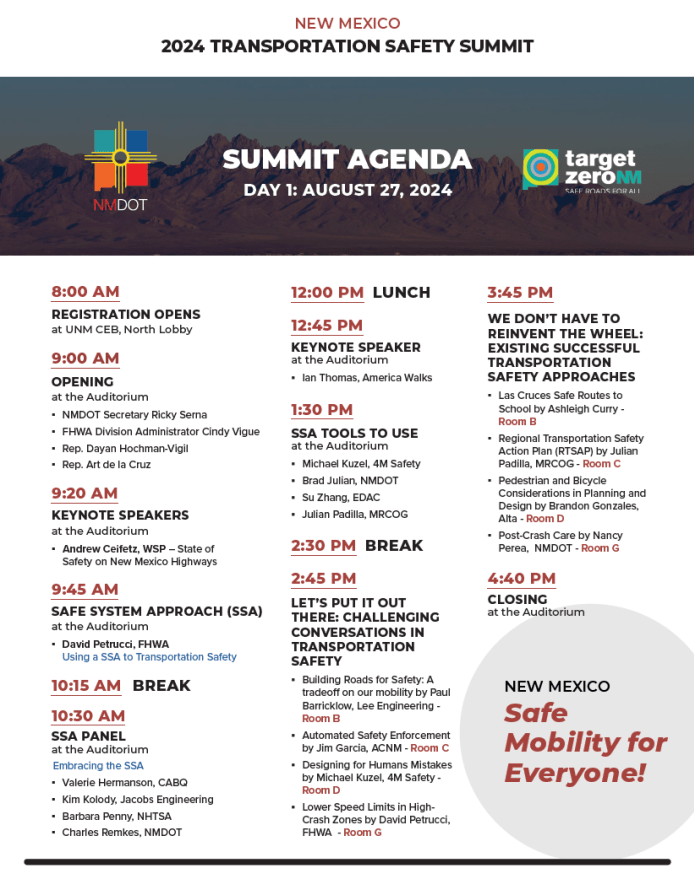 August 27th and 28th, 2024, I’ll be attending the Transportation Safety Summit at the University of New Mexico’s Continuing Education. This continues our effort last Fall with the New Mexico transportation Vulnerable Road User Safety Assessment and development of the Strategic Highway Safety Plan. The Summit brings together locals with national leaders to discuss and collaborate on safety approaches. Ian Thomas from America Walks is the keynote speaker. I’ll post more updates here! The agenda for day one is below.